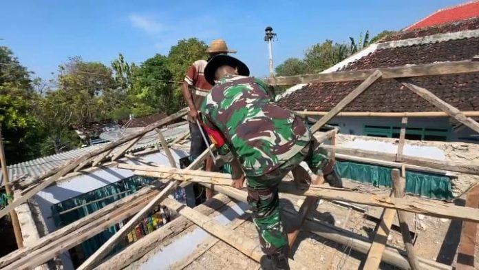 Di tengah teriknya matahari, Serda Faisal bersama warga bahu membahu mengganti genteng dan memperbaiki kerangka atap yang mengalami kerusakan.