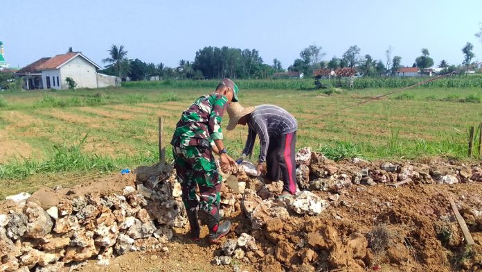 Dengan semangat gotong royong, Babinsa bersama masyarakat bekerja bahu membahu melakukan pengecoran dan pemasangan batu gunung untuk memperkokoh pondasi bangunan. Kehadiran TNI di tengah warga ini disambut antusias karena dinilai meringankan pekerjaan mereka.