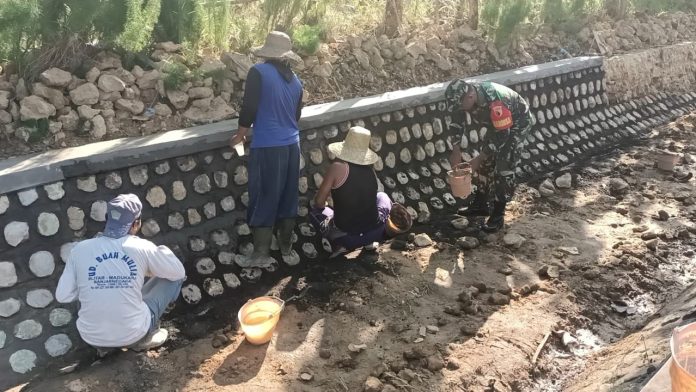 Sumenep, JNN.co.id – Babinsa Koramil 0827/02 Kalianget, Serka Amano, bersama masyarakat Desa Cabbiya bergotong royong membangun kirmir di aliran sungai Dusun Gedungan, Kecamatan Talango, Kabupaten Sumenep, Minggu (12/10/2025).