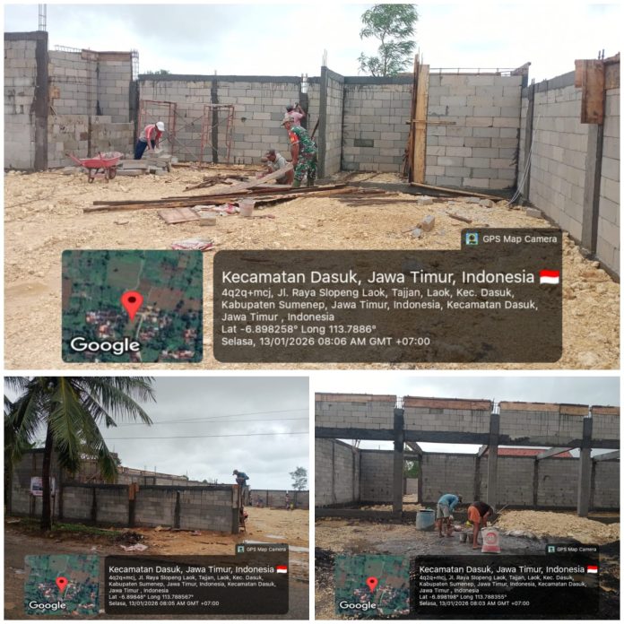 Sumenep, JNN.co.id – Pembangunan Gedung Koperasi Desa/Kelurahan Merah Putih di Desa Slopeng, Kecamatan Dasuk, Kabupaten Sumenep, Jawa Timur, memasuki tahap pemasangan bata ringan dan pengerjaan fasilitas kamar mandi, Selasa (13/1/2026).