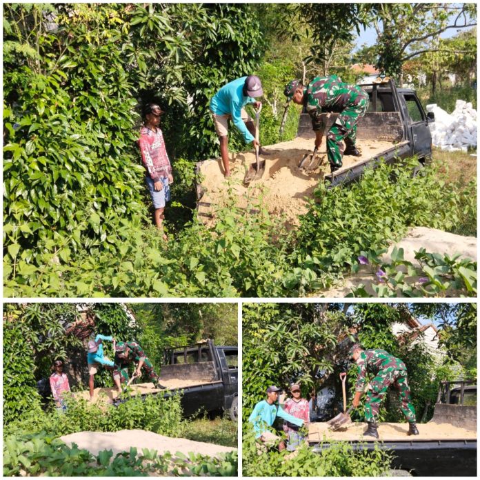 Dengan penuh semangat kebersamaan, Sertu Suyono bersama warga bahu membahu menurunkan pasir sebagai material utama pembangunan rumah.