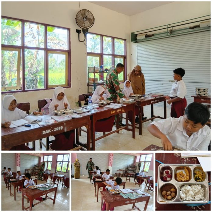 Babinsa hadir sejak awal proses pendistribusian dari dapur hingga makanan diterima langsung oleh siswa.