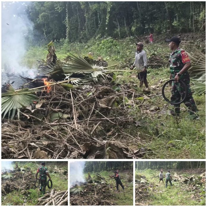 Sumenep, JNN.co.id – Bintara Pembina Desa Koramil 06/Saronggi Kodim 0827/Sumenep Koptu Sugiyanto membantu membersihkan lahan milik warga yang berada di Desa Langsar Kecamatan Saronggi Kabupaten Sumenep, Selasa (27/1/2026).