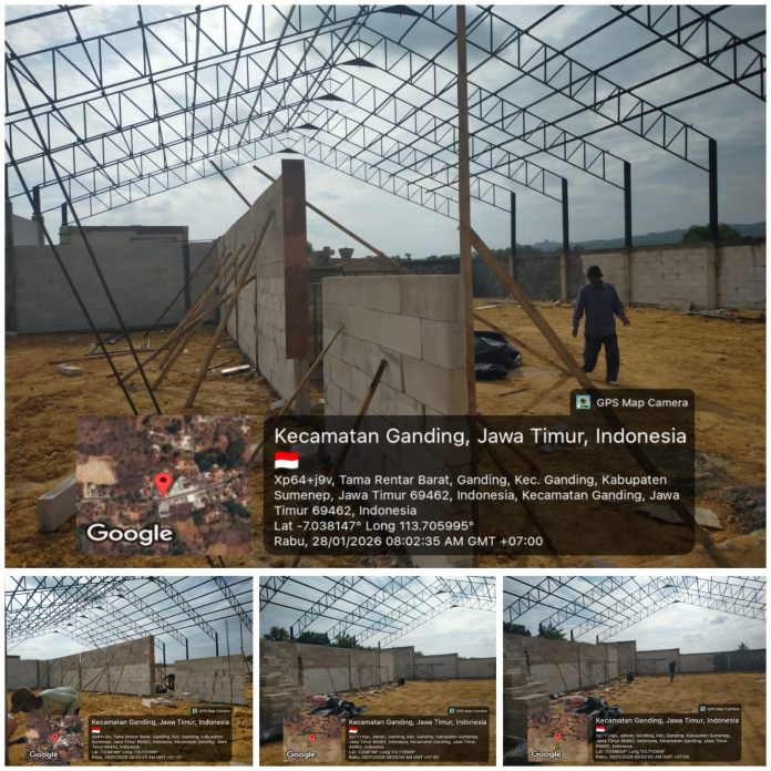 Sumenep, JNN.co.id – Progres pembangunan Koperasi Desa Merah Putih di Desa Ganding, Kecamatan Ganding, Kabupaten Sumenep, Jawa Timur, terus menunjukkan perkembangan signifikan. Hingga Rabu (28/1/2026) pagi, rangka baja atap bangunan utama telah terpasang, disertai pengerjaan pemasangan bata ringan pada bagian dinding.