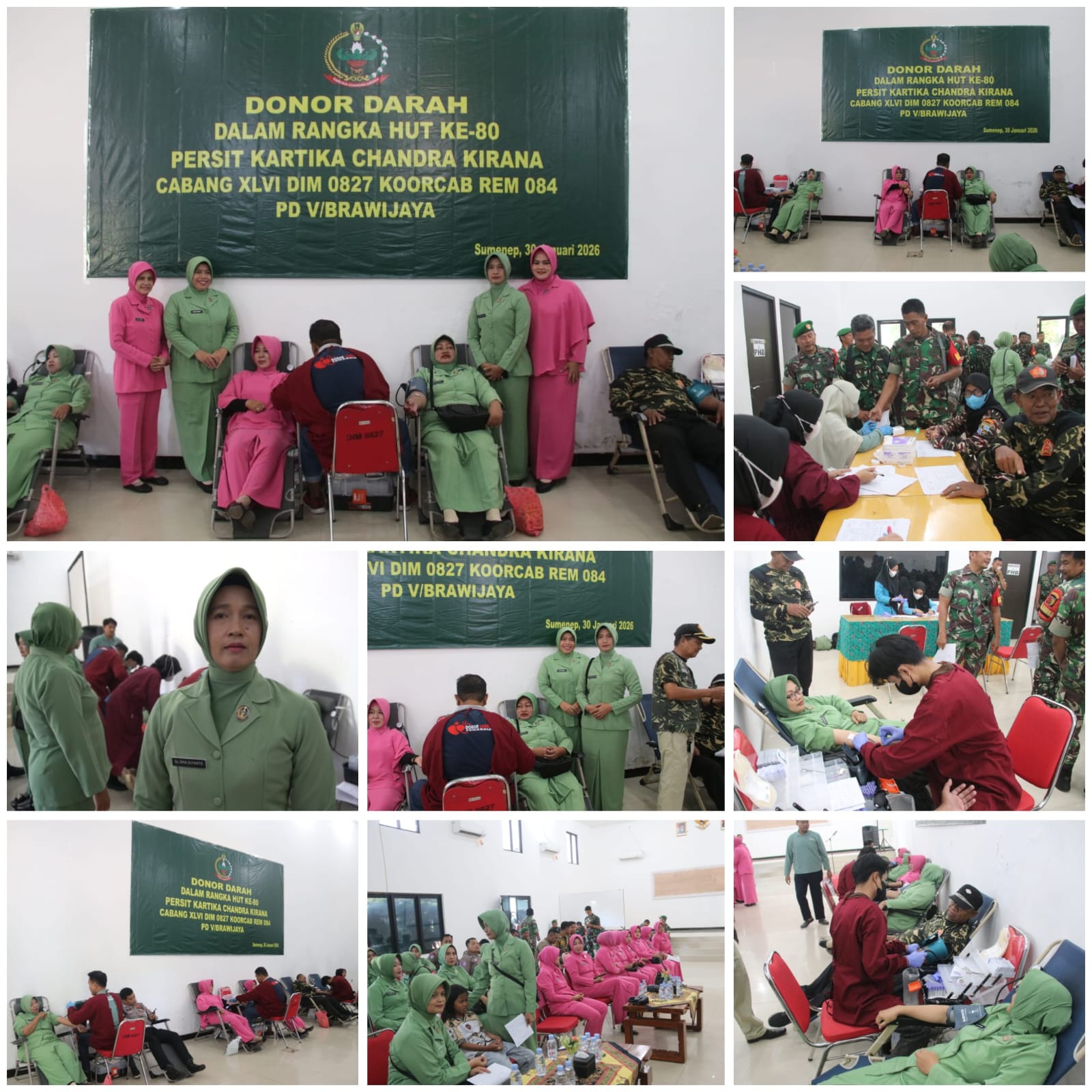 Sumenep, JNN.co.id – Persit Kartika Chandra Kirana (KCK) Cabang XLVI Kodim 0827/Sumenep menggelar kegiatan donor darah sebagai bentuk kepedulian sosial dan komitmen kemanusiaan kepada masyarakat. Kegiatan ini dilaksanakan dalam rangka memperingati Hari Ulang Tahun (HUT) ke-80 Persit KCK Tahun 2026.