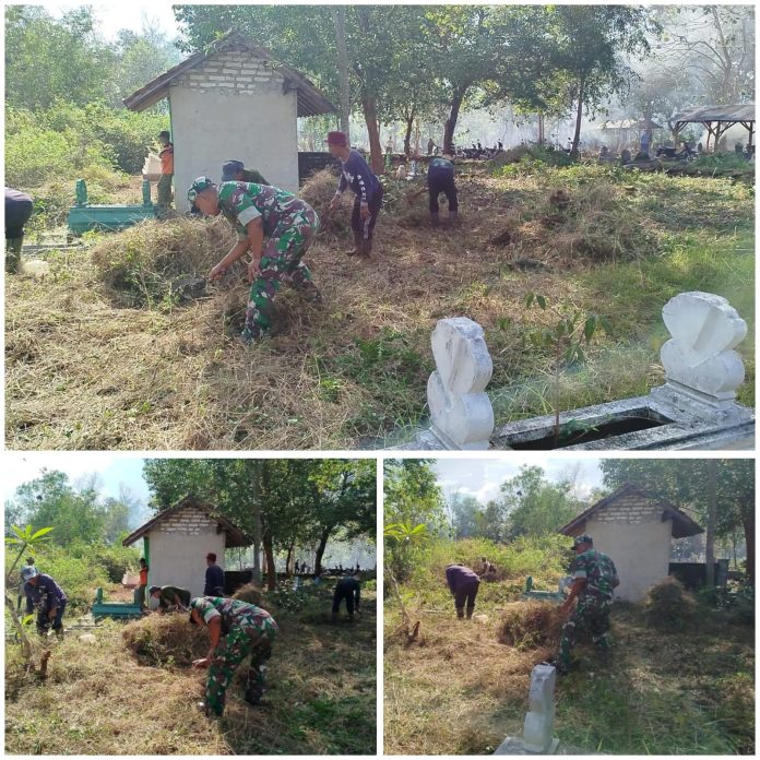 Dalam kegiatan tersebut, Babinsa bersama warga membersihkan rumput liar, sampah, serta merapikan area sekitar makam.