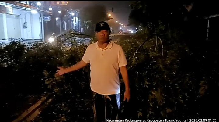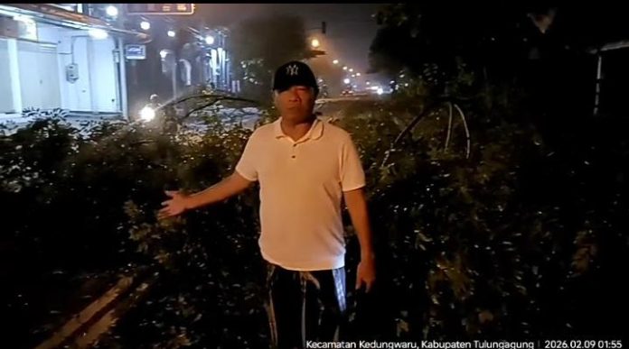 Tulungagung, JNN.co.id – Bupati Tulungagung, H. Gatut Sunu Wibowo, S.E., M.E., menunjukkan kesigapan saat melintas di Jalan Pahlawan, Desa Ketanon, Kecamatan Kedungwaru, Kabupaten Tulungagung, sekitar pukul 01.30 WIB. Dalam perjalanan tersebut, ia mendapati sebuah pohon tumbang yang melintang di badan jalan dan berpotensi membahayakan pengguna jalan.