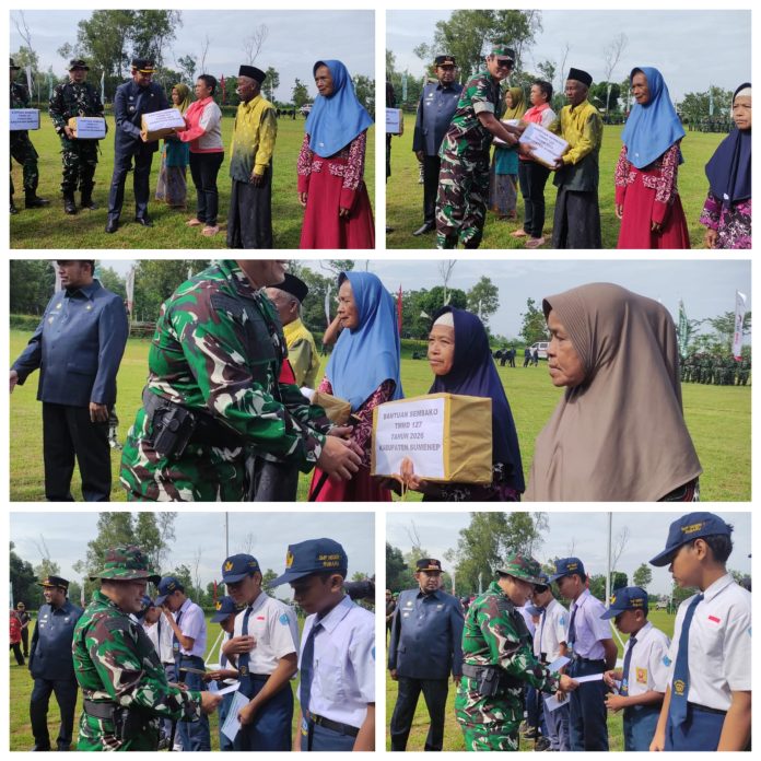 Sumenep, JNN.co.id – Dalam rangka Pembukaan program TMMD ke 127, Kodim 0827/Sumenep, Bupati Sumenep, Kasiter korem 084/BJ, Dandim 0827/Sumenep serta Forkopimda Kabupaten Sumenep menyerahkan bantuan sosial (bansos) dan santunan yang terpusat di lapangan SMPN 1 Kecamatan Rubaru Kabupaten Sumenep, Selasa (10/2/2026).