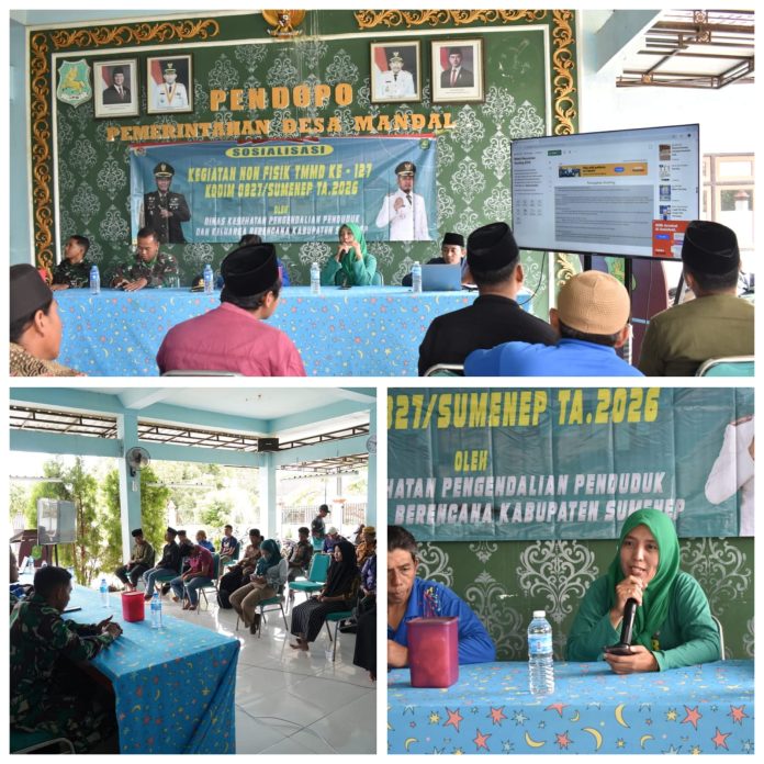 Sumenep, JNN.co.id – Upaya percepatan penurunan stunting terus digencarkan. Satgas TNI Manunggal Membangun Desa (TMMD) ke-127 TA 2026 Kodim 0827/Sumenep bersama Dinas Kesehatan Pengendalian Penduduk dan Keluarga Berencana Kabupaten Sumenep menggelar penyuluhan keluarga berencana (KB), kesehatan, dan pencegahan stunting di Balai Desa Mandala, Kecamatan Rubaru, Kabupaten Sumenep, Jumat (13/2/2026).