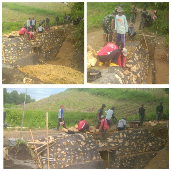 Sejak pagi, anggota Satgas TMMD bersama warga bahu-membahu menyusun batu gunung satu per satu. Material dipilih langsung dari batu alam berkualitas, kemudian diperkuat dengan adukan semen untuk memastikan konstruksi solid dan tahan terhadap tekanan tanah, terutama saat curah hujan tinggi.