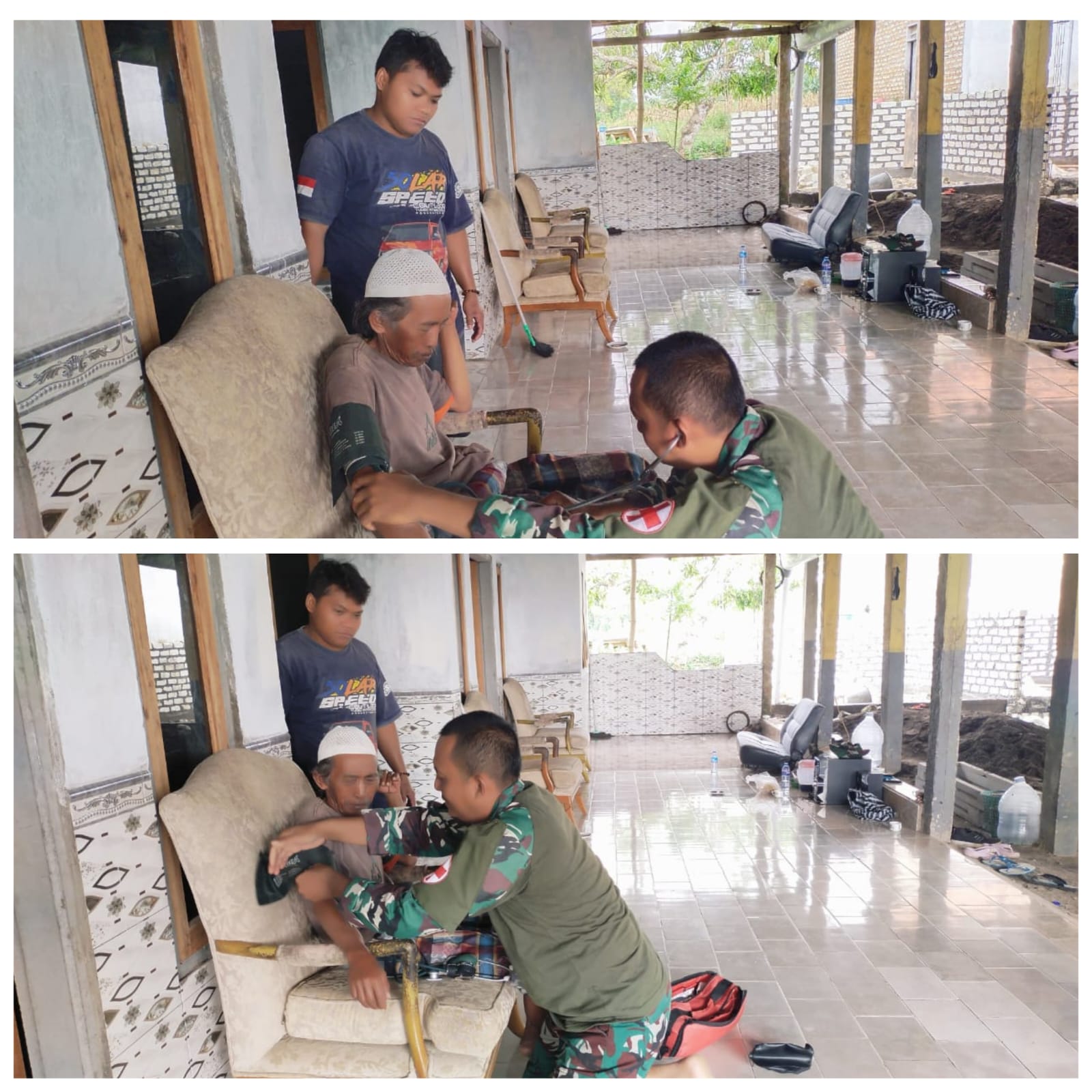 Tim kesehatan Serka Susiyanto melakukan pemeriksaan terhadap Busri, warga yang mengeluhkan batuk berkepanjangan disertai sakit kepala. Pemeriksaan diawali dengan pengecekan tekanan darah, dilanjutkan pemeriksaan kondisi umum, serta pemberian obat sesuai hasil pemeriksaan.