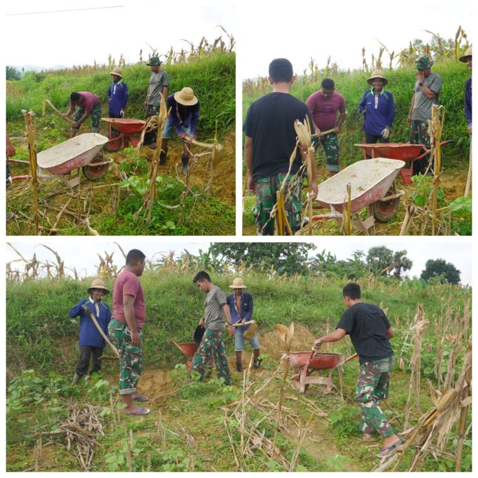 Dalam pelaksanaan pembangunan tersebut, personel Satgas TMMD bersama warga setempat bergotong royong menggunakan argo (alat angkut sederhana) untuk mengangkat dan memindahkan timbunan tanah sebagai bagian dari proses penyiapan pondasi rumah.