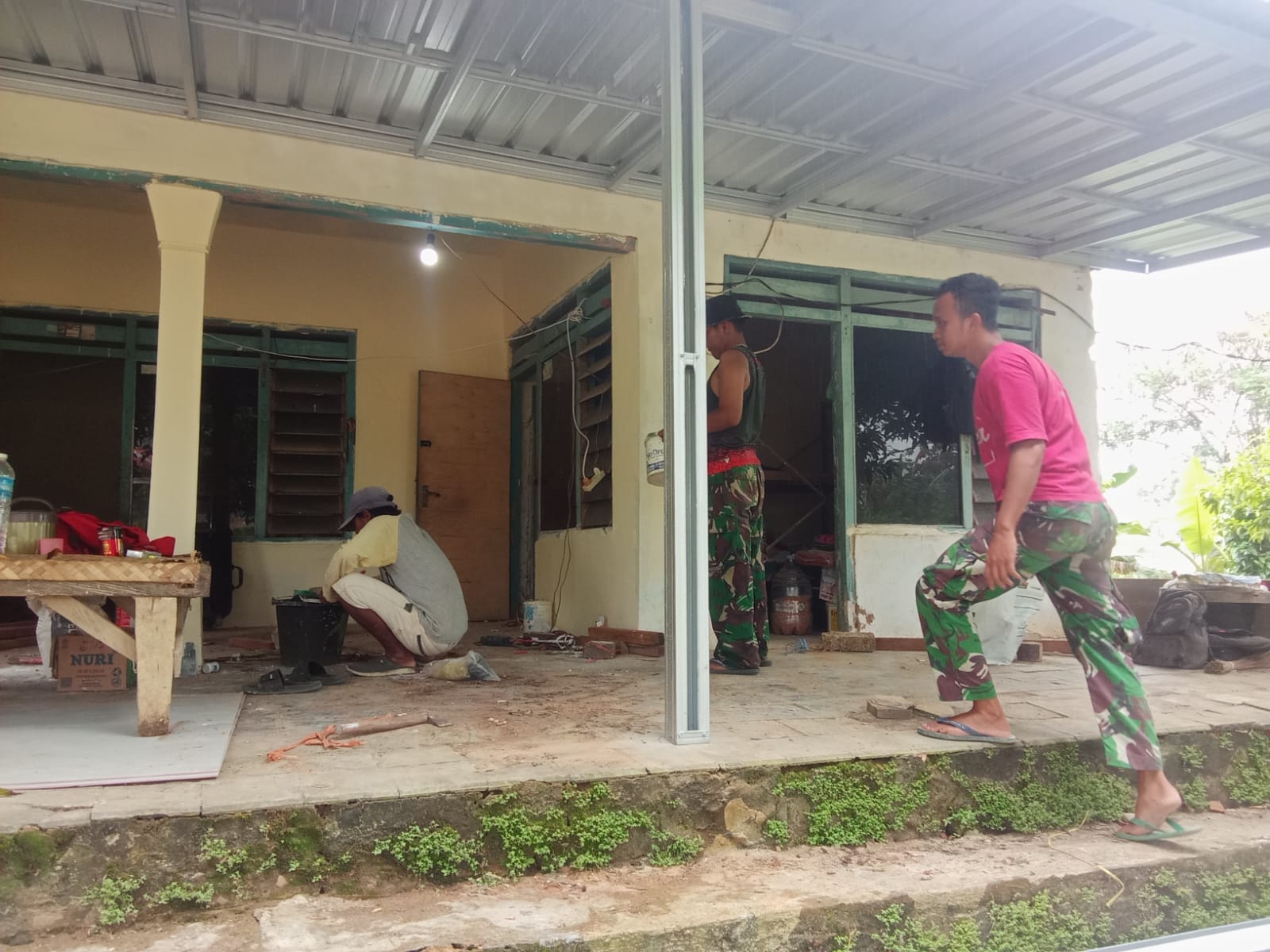 Sejak pagi, Praka Yunus bersama anggota Satgas lainnya membersihkan sisa adukan semen, mengamplas bagian plester yang masih kasar, lalu melapisi dinding dengan cat dasar agar permukaan rata dan siap memasuki tahap akhir.