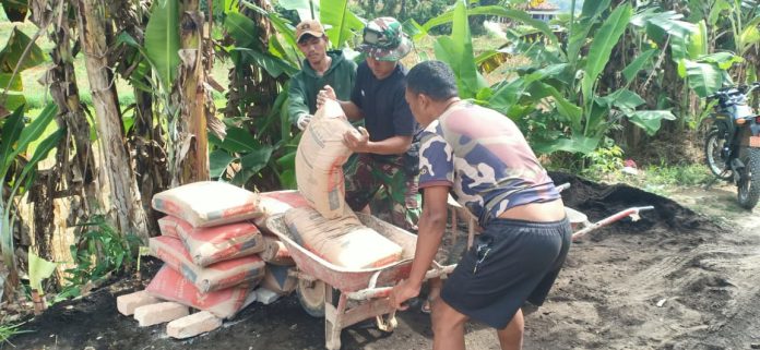 Selasa (24/2/2026), anggota Satgas terlihat mengangkut semen menggunakan troli menuju lokasi rumah milik Bapak Samik di Dusun Karang.