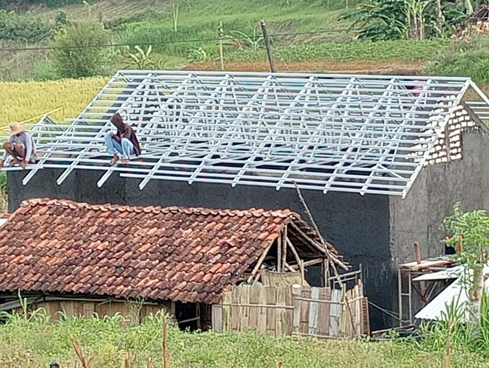 Pada tahap pengerjaan saat ini, personel Satgas menurunkan genteng baru dari mobil pengangkut sekaligus memasang rangka atap baja ringan sebagai bagian dari proses penyelesaian bangunan.