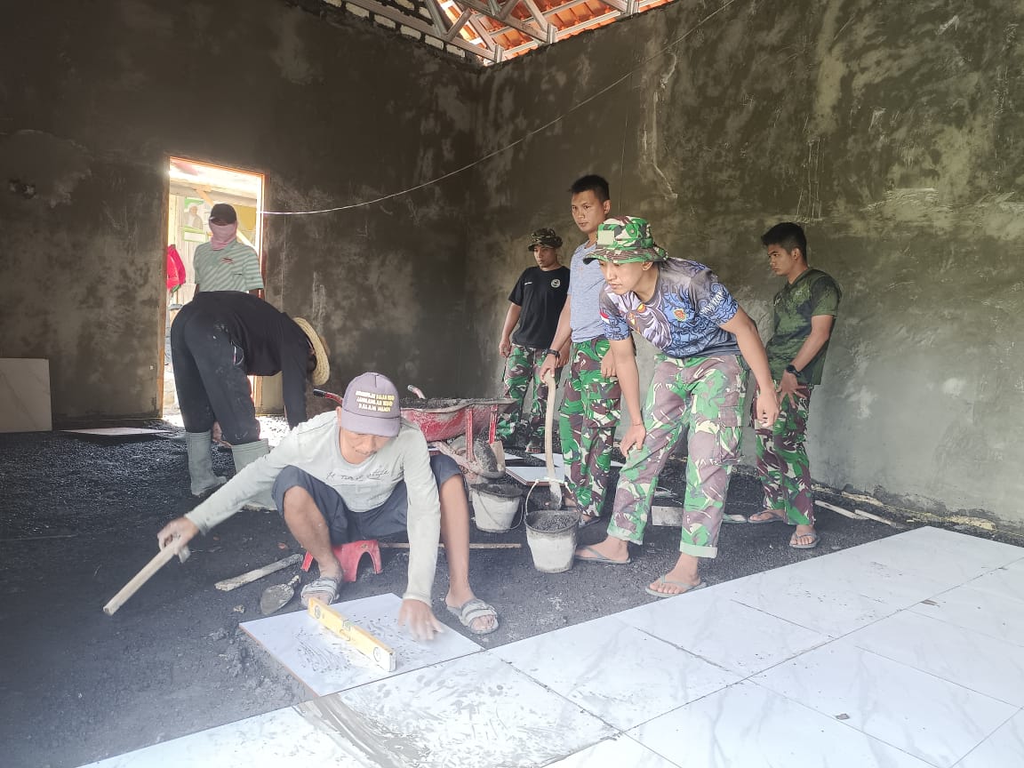 Pada tahap akhir pembangunan, anggota Satgas TMMD Sertu Prakerti Cahyo melaksanakan pemasangan keramik lantai rumah. Pekerjaan tersebut menjadi bagian dari proses finishing agar rumah yang dibangun benar-benar siap ditempati oleh pemiliknya.