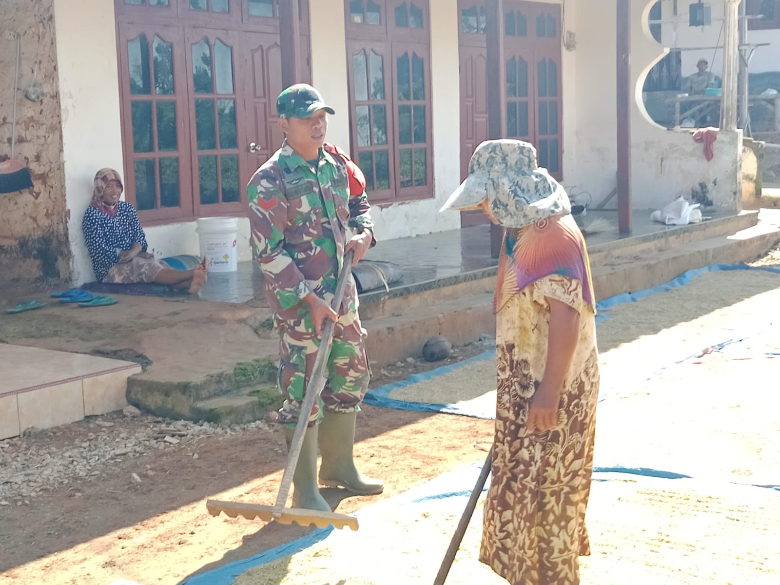 Sementara itu, salah satu petani setempat, Ibu Qumriyah mengaku senang dan terbantu dengan kehadiran Babinsa yang ikut membantu proses penjemuran gabah hasil panen.