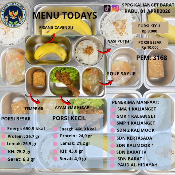 Sumenep, JNN.co.id – Program Makan Bergizi Gratis (MBG) di wilayah Kecamatan Kalianget dan Talango, Kabupaten Sumenep, menyasar ribuan siswa dari berbagai jenjang pendidikan. Penyaluran dilakukan di lima Satuan Pelayanan Pemenuhan Gizi (SPPG) dengan total distribusi mencapai lebih dari 10 ribu porsi makanan, Rabu (1/4/2026).