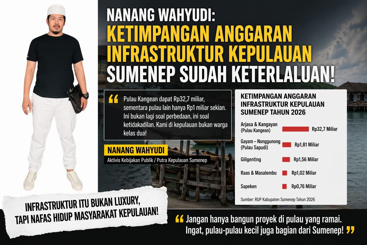Sebagai putra kepulauan, Nanang Wahyudi menilai ketimpangan anggaran infrastruktur di wilayah Kepulauan Sumenep bukan lagi sekadar persoalan angka, melainkan cerminan cara pandang pembangunan yang belum sepenuhnya berpihak pada masyarakat pulau.