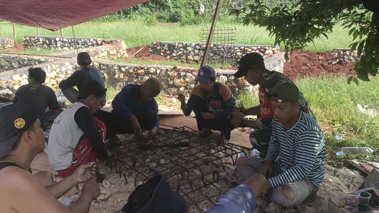 Babinsa bersama warga terlihat kompak merakit rangka besi, mengikat tulangan, hingga menyiapkan tahap pengecoran yang menjadi fondasi kekuatan masjid ke depan.