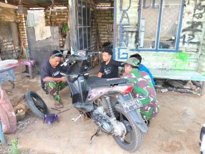 Di sela aroma oli dan suara mesin, Babinsa duduk santai bersama tukang servis motor. Obrolan ringan pun mengalir, mulai dari kondisi ekonomi warga hingga situasi keamanan lingkungan. Suasana akrab itu menjadi jembatan kuat antara TNI dan masyarakat.