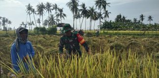 Babinsa Turun Ke Sawah Bantu Petani Panen Padi di Pragaan Laok