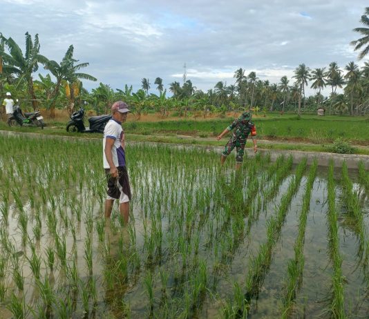 Jaga Kesuburan Tanaman, Babinsa Serda Sugiono Bantu Petani Bersihkan Rumput Padi