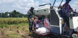 Babinsa Bersama Petani Panen Padi Gunakan Mesin Combine Havester